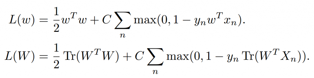 - Tips:这两个公式长得很类似,其实推一下就发现是完全一样的(会操作矩阵每一个元素),因此可以用常规的SVM优化器。