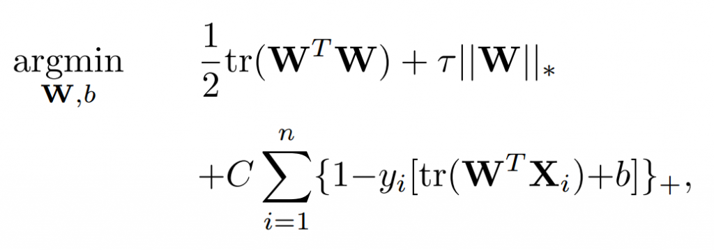 为了利用这种结构信息,我们提出一种新的分类方法,我们称之为支持矩阵机(SMM)