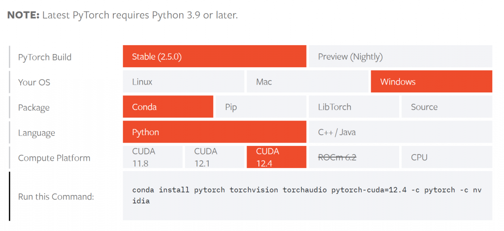 我们选择Windows、Conda、Python,这里的“Compute Platform”就是当前Pytorch支持的最高版本,当前是12.4,我们显卡最高支持是12.7,是支持的。这也是我们需要下载的CUDA Toolkit的版本。