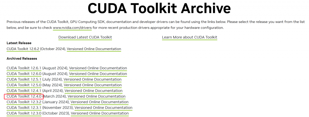 注意是“Toolkit Archive”,因为我们不能进入官网下载最新版本的CUDA,最新版会导致PyTorch不识别导致报错。找到对应版本,目前我这里是12.4,因此下载12.4.0的版本: